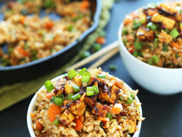 Add cooked rice, tofu, and remaining sauce and stir. Cook over medium-high heat for 3-4 minutes, stirring frequently.