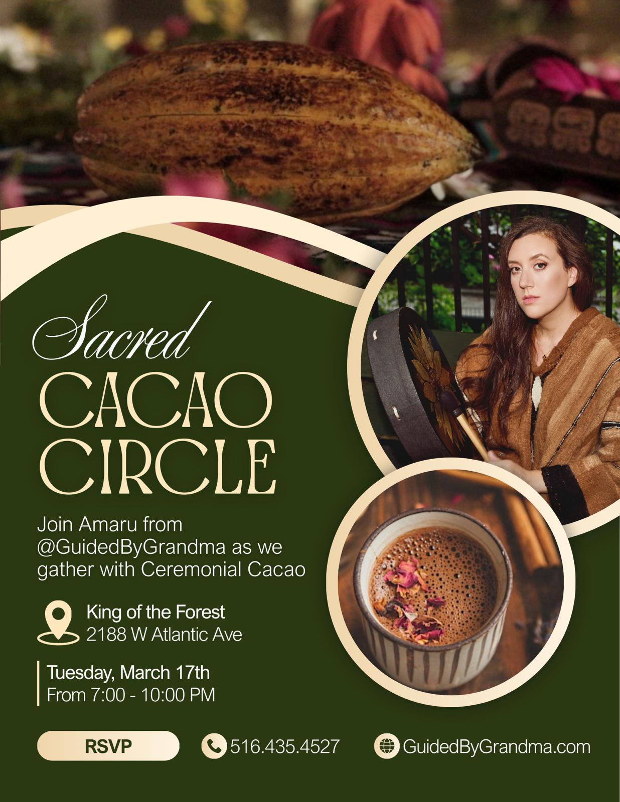 This special evening gathering will be guided by Amaru from @GuidedByGrandma, bringing together community, ceremonial cacao, and intentional connection.