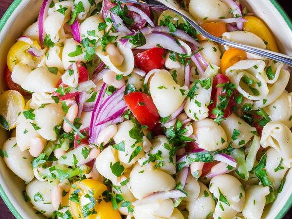 Finish mixing the salad: Pour the dressing over the pasta and beans and stir. Add the tomatoes, celery, onion, and parsley to the pasta mixture and stir gently but thoroughly. Taste for seasoning and add more salt and pepper, if you like. You can also squeeze some lemon juice over the top if it needs a touch more brightness.