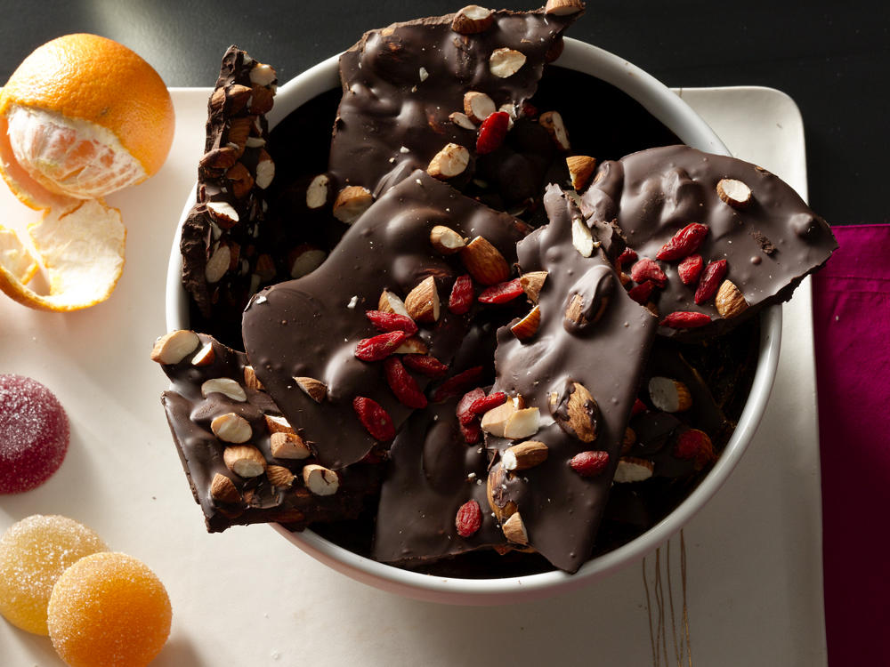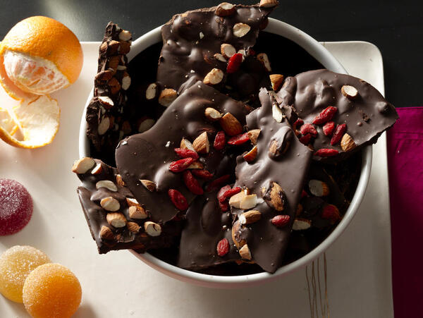Immediately pour chocolate mixture onto pad or foil; spread evenly into a 16-by-11-inch rectangle. Sprinkle with remaining berries and nuts, pressing gently into chocolate. Chill for 30 to 40 minutes or until very firm. Break into about 34 3- to 4-inch pieces. Store between pieces of parchment in an airtight container in a cool place.